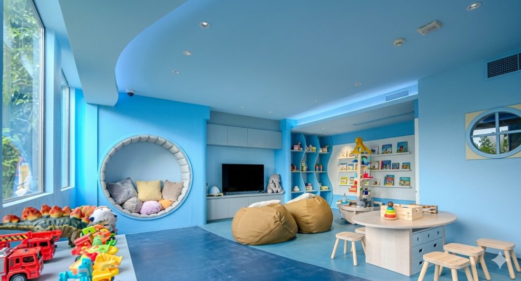 This playroom was overflowing with cuteness. We divided the room into distinct sections so that there would be enough space and storage for all of the toys and activities. A small desk accompanied by a supplies cart...